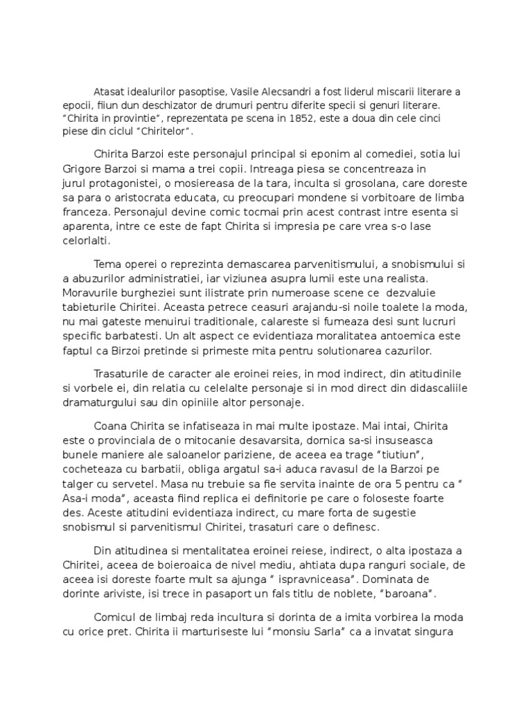 Chirita in provintie este structurata pe doua acte. Aristita calipsita si gulita. Coana chirita se infatiseaza in mai multe ipostaze. Referat despre chirita in provintie caracterizarea personajelor trasaturile de caracter ale eroinei reies in mod indirect din atitudinile si vorbele ei din relatia cu celelalte personaje si in mod direct din didascaliile dramaturgului sau din opiniile altor personaje.